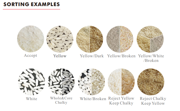 Designed for sorting various types of rice based on color differences, such as sorting yellow or chalky rice, either individually or simultaneously.
